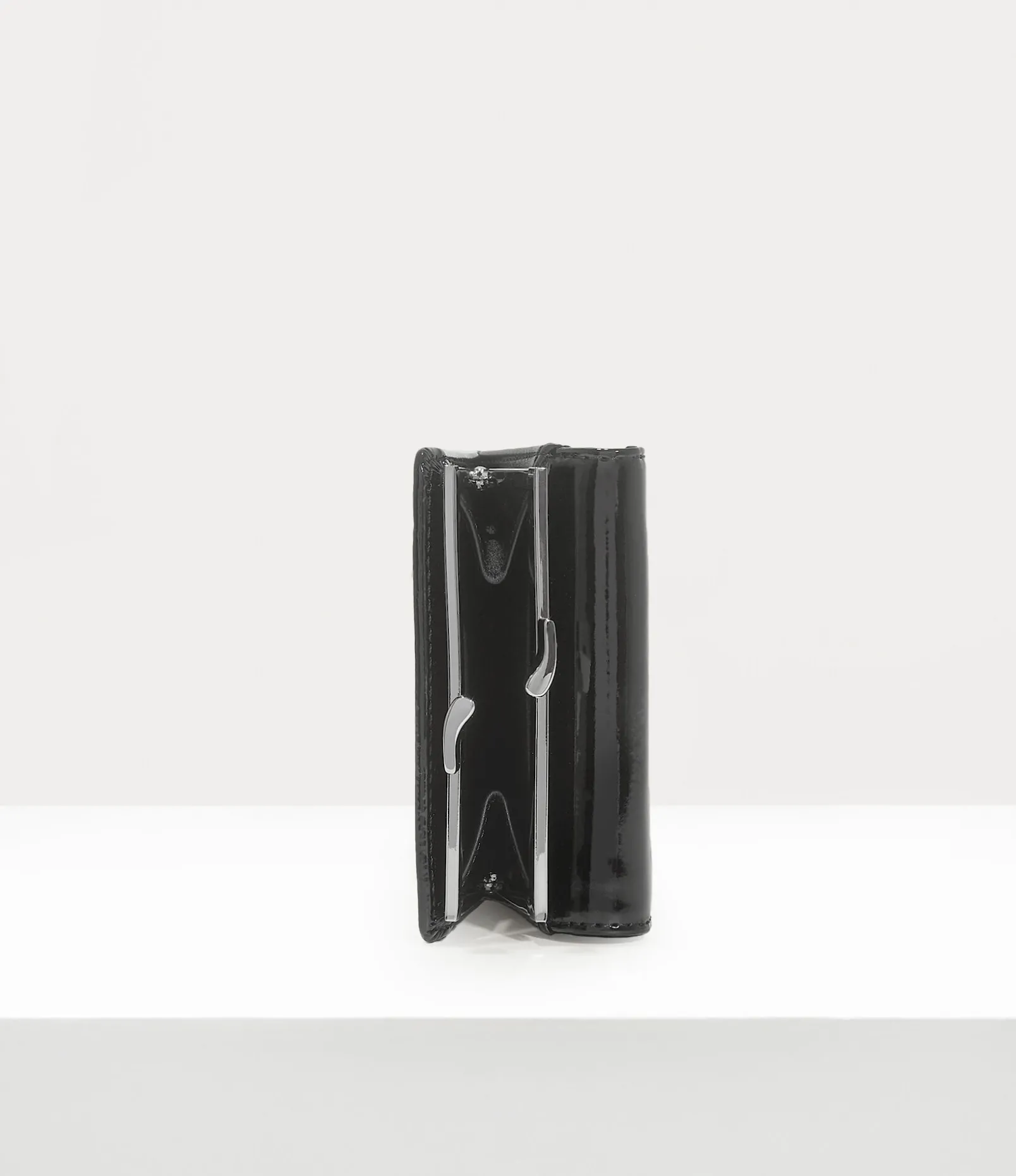 Our Small Frame wallet features a tri-fold leather silhouette, adorned with a tonal bas-relief orb plaque that epitomises Vivienne’s vision of launching tradition into the future. The patent finish, reminiscent of the liquid latex and rubberwear in our iconic Sex boutique, evokes our house’s signature punk aesthetic.