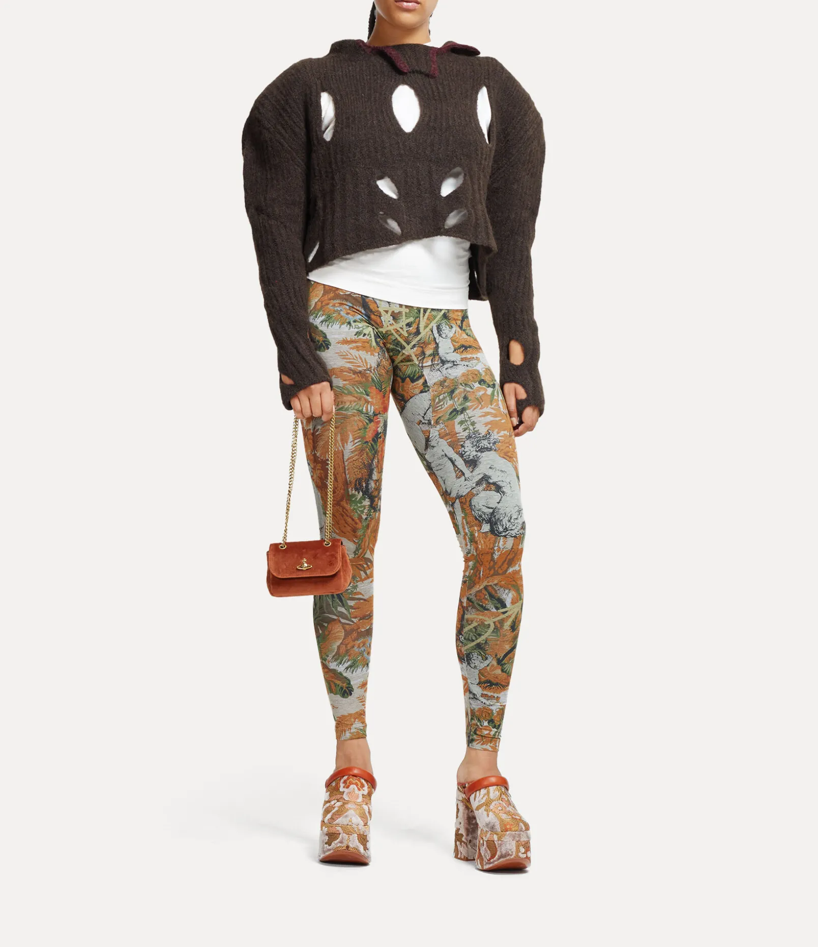 Our Small purse receives a rectangular silhouette, complete with a classic brass chain and an antique gold-tone orb plaque on the magnetic closure – recalling Vivienne’s vision of launching tradition into the future. The piece adopts a soft cotton velvet finish, paying homage to the opulent furniture of the early 19th century, a key influence for this season’s collection.