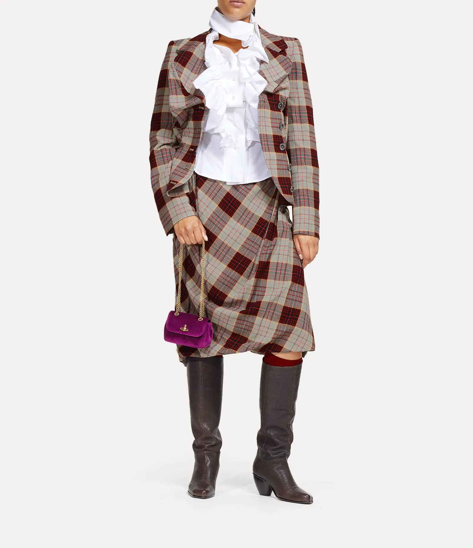 Our Small purse receives a rectangular silhouette, complete with a classic brass chain and an antique gold-tone orb plaque on the magnetic closure – recalling Vivienne’s vision of launching tradition into the future. The piece adopts a soft cotton velvet finish, paying homage to the opulent furniture of the early 19th century, a key influence for this season’s collection.