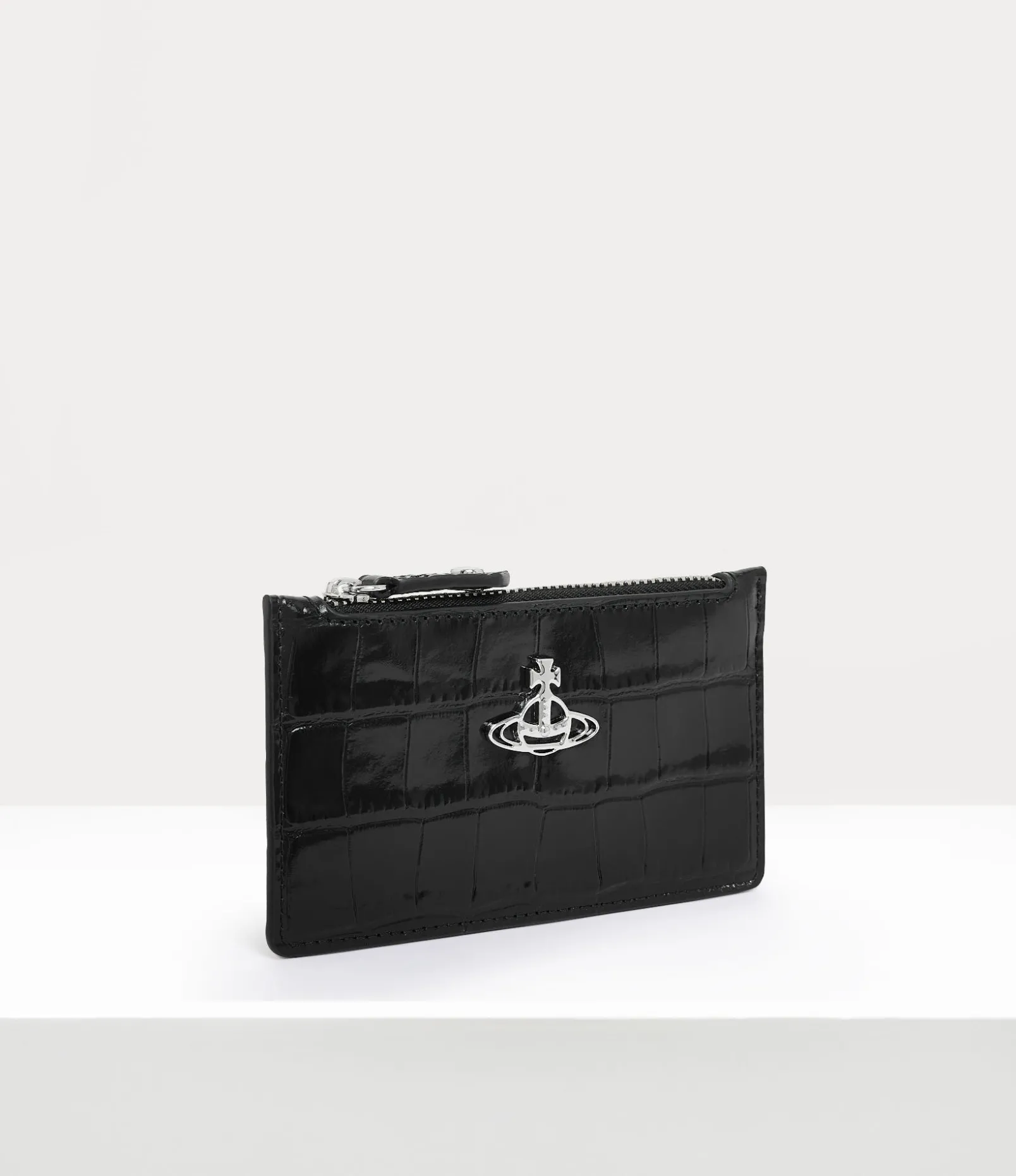 The Slim Long card holder is made of croc-embossed leather and features an engraved zip closure, four card slots on the back and a lined version of our orb on the front in silver tones.