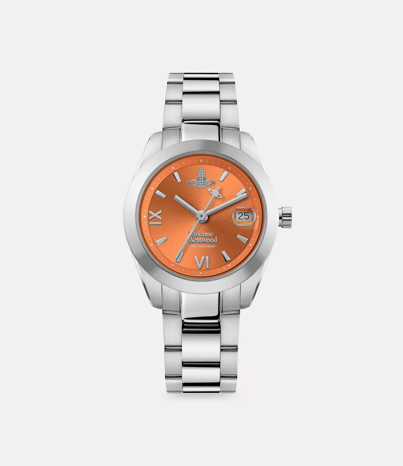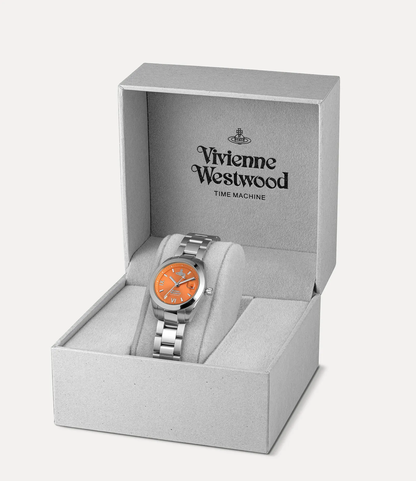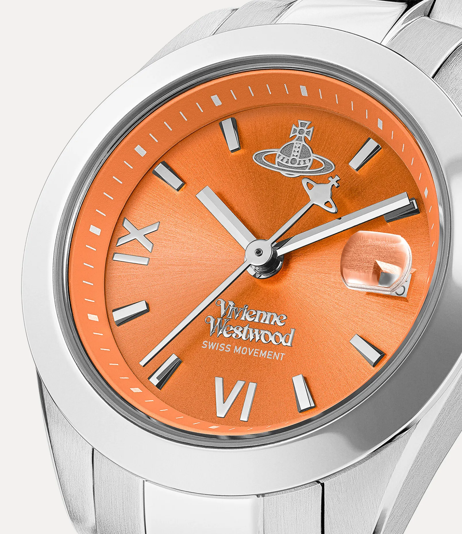 Part of our popular Fenchurch collection, this season’s Fenchurch watch features a distinctive three-link bracelet, finished in polished silver tones. Named after London’s historic financial district, which resonated with Vivienne, this piece is detailed with a date feature at the three o’clock position, complete with an orange dial.