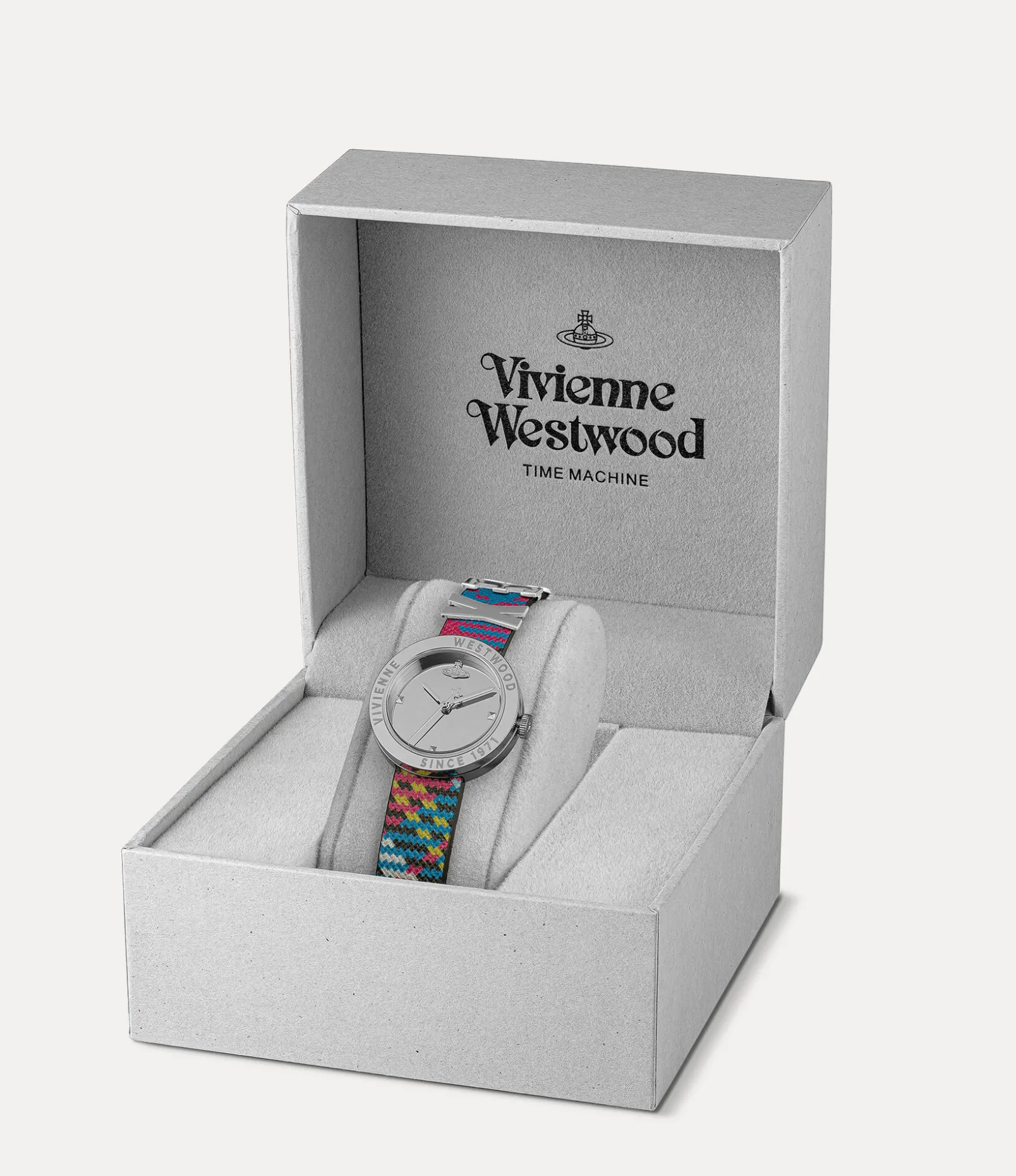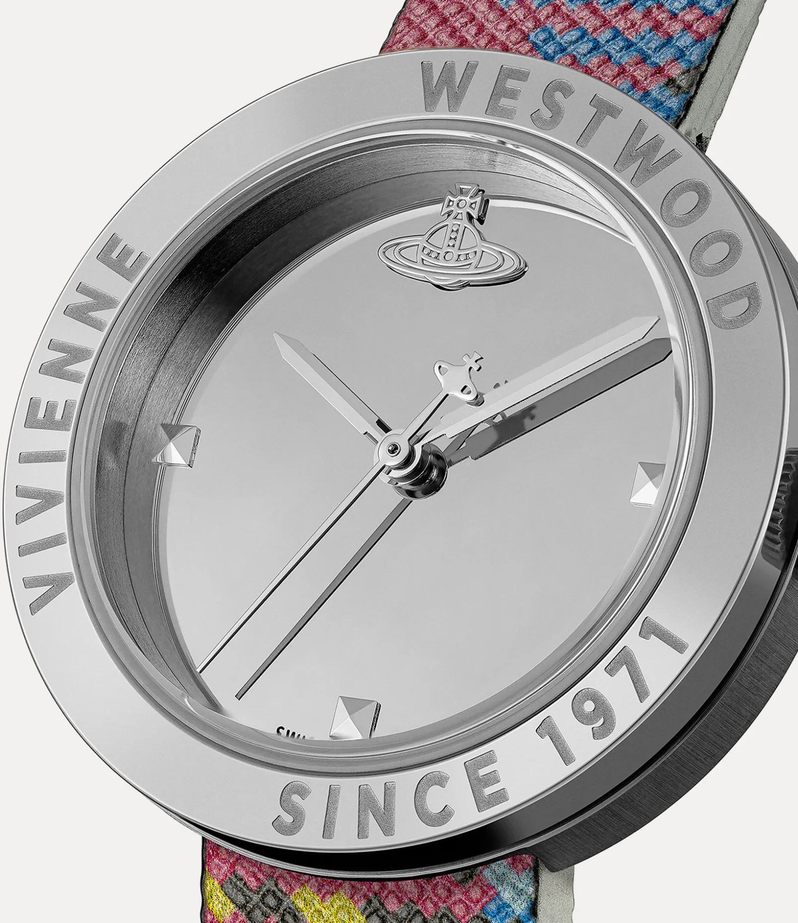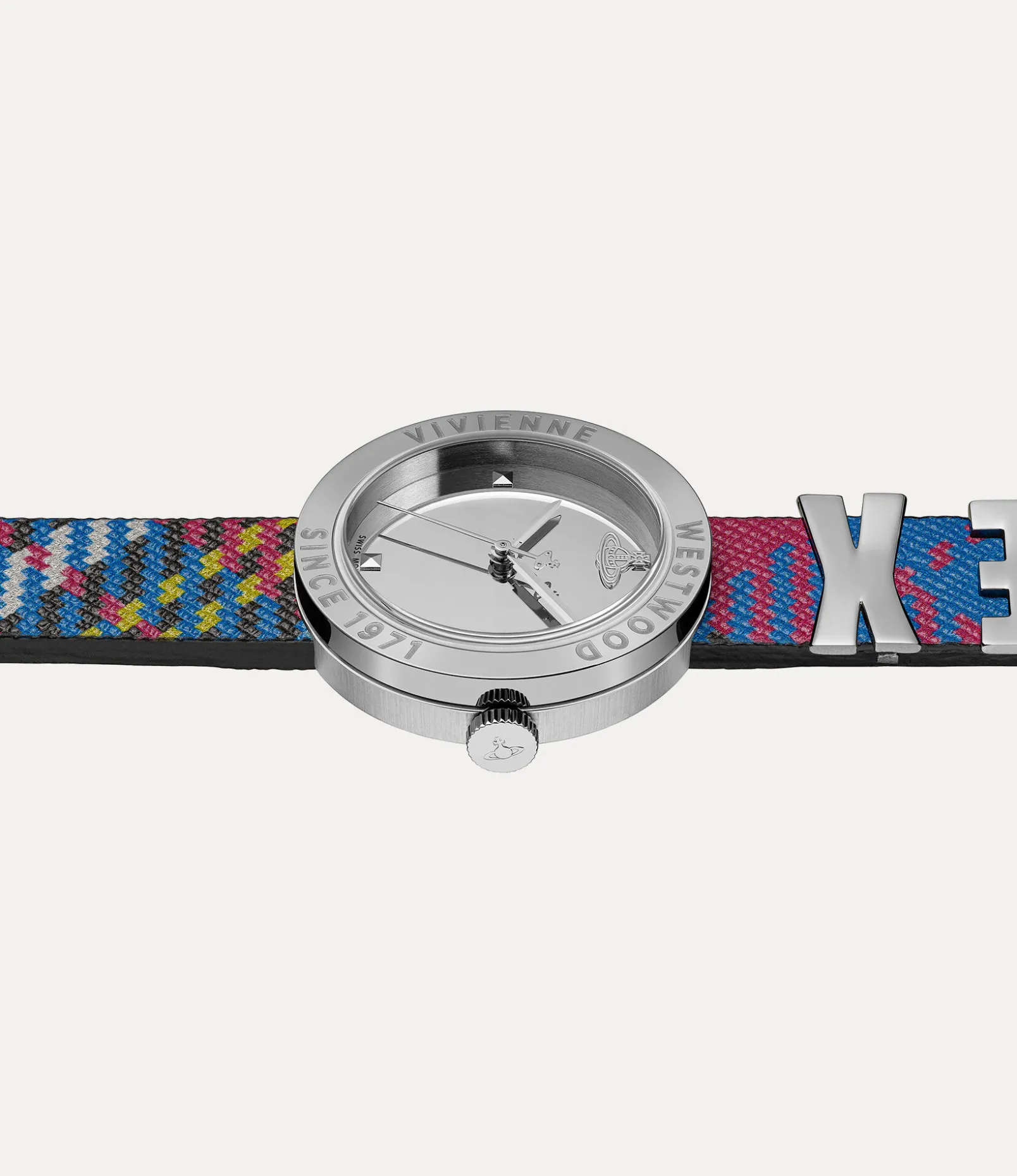 The tartan motif is an essential element of the house’s iconography, reminiscent of Vivienne’s signature punk style. The Rebel watch receives a tartan motif printed across the strap, complete with our archival ‘SEX’ lettering detail, first seen on the Sex choker from our collection from 1989.